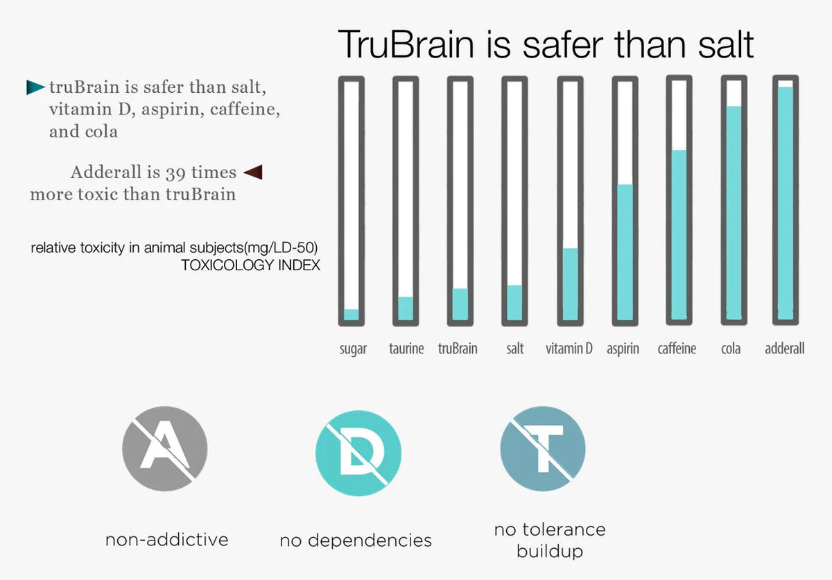 The active nootropics in TruBrain, like noopept, have a long track record of performance and safety. The TruBrain formula is also fortified with building blocks, like magnesium and choline, that the brain uses for fuel. These nutrients are naturally found in foods like spinach, artichokes, and kale. While present in many whole foods, one cannot attain beneficial amounts of nootropics from eating whole foods alone. That's where TruBrain comes in. See our full list of ingredients here.