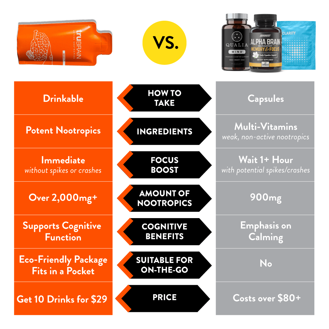 Whether you are looking to overcome problems like procrastination, brain fog, or ADHD... or you are looking to improve your ability to harness focus, clarity, and short-term memory... TruBrain provides the cognitive support when you need it most. TruBrain is suitable and safe for adults of all ages and lifestyles. Children, pregnant or nursing women should seek professional medical advice before taking this or any other dietary supplement.